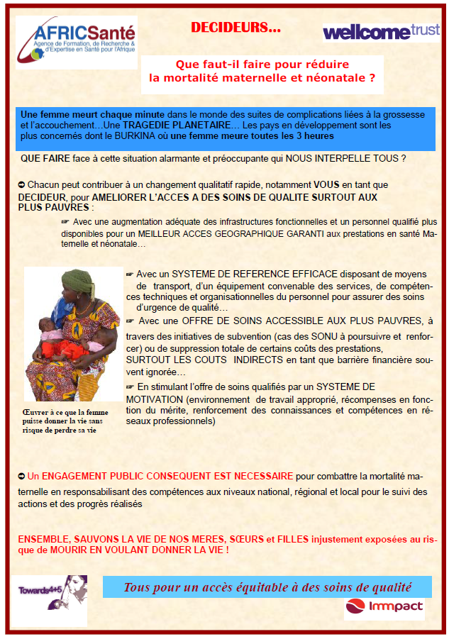 Une femme meurt chaque minute dans le monde des suites de complications liées à la grossesse et l’accouchement…Une TRAGEDIE PLANETAIRE… Les pays en développement sont les plus concernés dont le BURKINA où une femme meure toutes les 3 heures…..